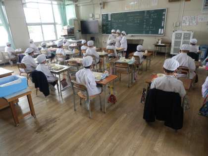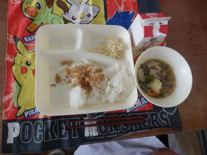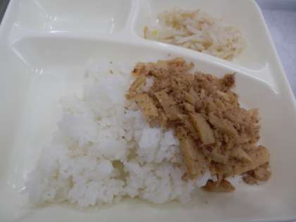 今日の給食は、ごはん、牛乳、肉じゃが、もやしのゆずの香あえ、ごまかかいためです。ごまかかいための中に、たけのこが入っています。わたしたちが食べているたけのこは、竹の若い茎の部分です。芽が地面から出る前に、土が盛り上がってくるのを目安に掘り出します。たけのこがたくさん収穫できるのは、4月から5月ごろです。