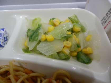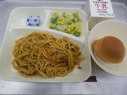 今日の給食は、1/2黒糖パン、牛乳、カレースパゲッティ、レタスとコーンのサラダ、固形チーズです。サラダに入っている、レタスは、1年中全国で栽培されています。涼しくて乾いた気候で育ちやすく、季節ごとに産地が変わります。水分を多く含む野菜でビタミンCや食物せんいなども含んでいます。