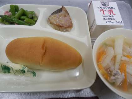 今日の給食は、コッペパン、牛乳、ソフトマーガリン、スープ、かつおのガーリックマヨネーズ焼き、グリーンアスパラガスとベーコンのソテーです。グリーンアスパラガスは、カロテンやビタミンCを多く含みます。また、「アスパラギン酸」という体の疲れをとる働きがある成分も含まれています。グリーンアスパラガスは若い芽と茎の部分を食べる野菜です。畑で芽を出すのは、春先から夏の初めで、この頃にとれるものが、とてもおいしいです。