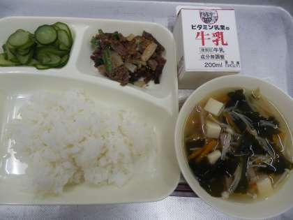 今日の給食は、ごはん、牛乳、プルコギ、とうふとわかめのスープ、きゅうりの甘酢づけです。自然の恵みに感謝して給食を食べていますか?