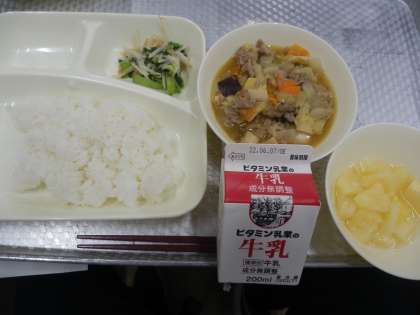 今日の給食は、ごはん、牛乳、チンゲン菜ともやしのしょうがあえ、八宝菜、パインアップルです。今日のおかずの八宝菜の「八」は数が多いことを意味する言葉で、よい材料をたくさん使って作った料理のことを言います。今日の八宝菜には、豚肉、玉ねぎなどの8種類の材料が使われています。