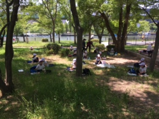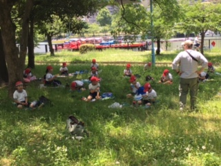 町たんけんと自由あそびが終わり、お弁当の時間です。朝から十分体を動かしたので、お腹が空きました。しっかり食べましょう。