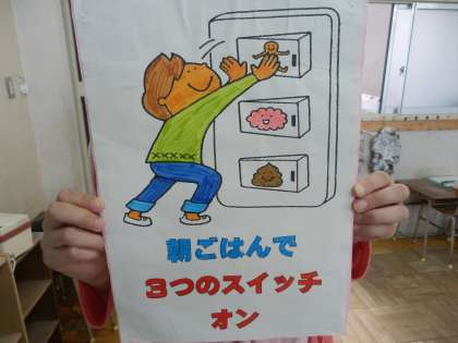 1つ目は≪おなかののスイッチ≫2つ目は≪体のスイッチ≫3つ目は≪脳のスイッチ≫です。1時間目から元気に活動するためにも、朝ご飯をしっかりと食べて登校してください。