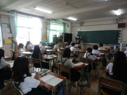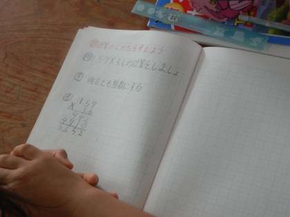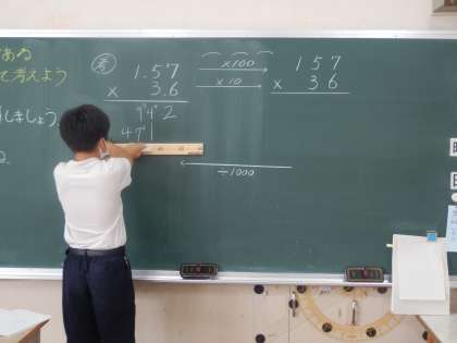 5年生の算数では、1.57×3.6の計算の仕方を考えました。両方とも整数にして計算し小数点をどの位置につければよいのかを考えました。計算のきまりを使って考えることができました。