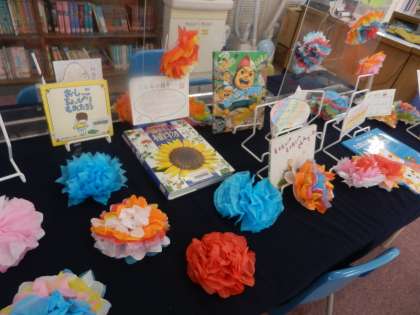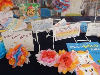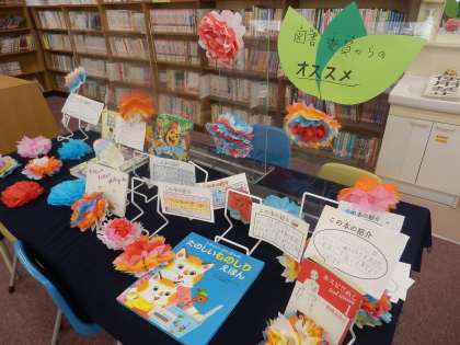 図書室では、図書委員会のみなさんのおすすめ本のコーナーがあります。楽しい本がたくさん紹介されています。みなさんもぜひ読んでください。