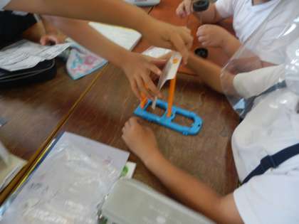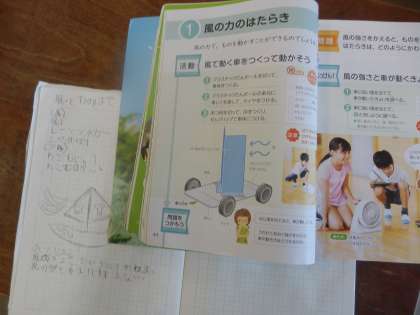 3年生の理科では、風の力で動く仕組みやその車づくりを班で行いました。