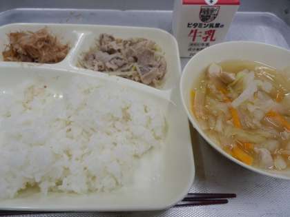 今日の給食は、ごはん、牛乳、豚肉ともやしのいためもの、すまし汁あつあげのしょうがじょうゆかけです。今日の給食の豚肉ともやしのいためものには、もやしが多く含まれています。もやしは、ブラックマッペや緑豆。大豆などの豆を水につけて、温かくて暗い所に置いて発芽させます。出てきた芽が、ブラックマッペや緑豆は5センチメートルぐらい、大豆は10センチメートル〜15センチメートルぐらいに成長したら食用にします。