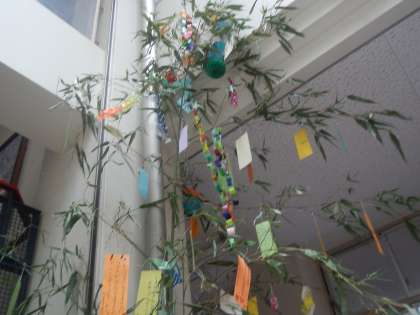 もうすぐ七夕です。願い事がたくさん短冊に書いてあります。