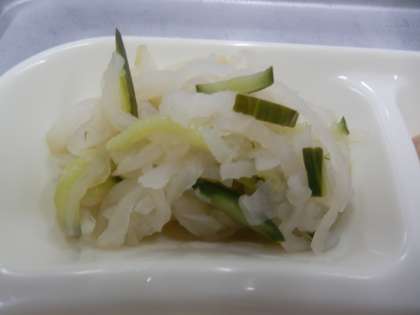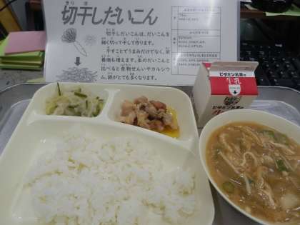 今日の給食は、ごはん、牛乳、鶏肉のしょうゆマヨネーズ焼き、とうがんのみそ汁、切り干し大根のゆず香あえです。切り干し大根は、だいこんを細く切って干して作ります。干すことでうまみだけでなく、栄養価も増えます。生のだいこんと比べると食物せんいやカルシウム、鉄がとても多くなします。