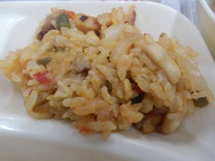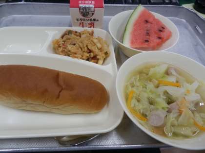今日の給食は、黒糖パン、牛乳、ウィンナーとキャベツのスープ、スイカ、パエリアです。パエリアは、スペインのバレンシア地方の代表的な料理です。「パエリア」という料理名はスペイン語で「鍋」を指す言葉がもとになっています。専用の浅くて丸い鍋で調理し、鍋から取り分けて食べる料理です。