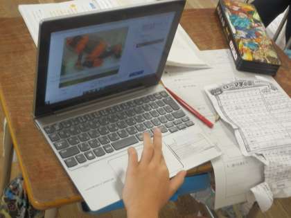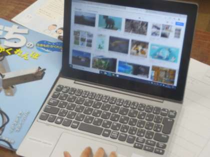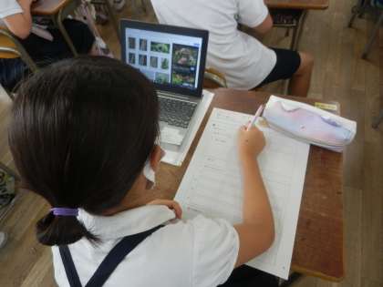 3年生の教室では、パソコンを使って「保護色を持つ動物や虫」について調べて分かったことをまとめていました。