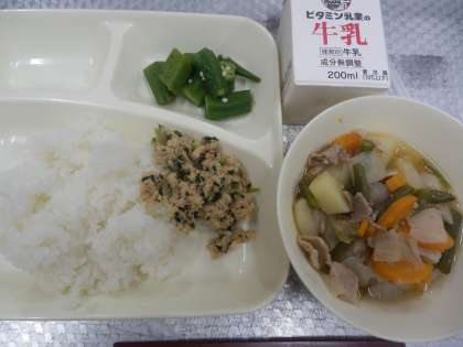 今日の給食は、ごはん、牛乳、豚肉とじゃがいもの煮物、オクラの梅風味、ツナっ葉いためです。オクラの原産地は、アフリカの東北部で、エジプトでは古くから食べられていました。切り口が星のような形をしたものがよく使われていますが、丸い形のものもあります。オクラには腸のはたらきをよくする食物せんいを多く含んでいます。