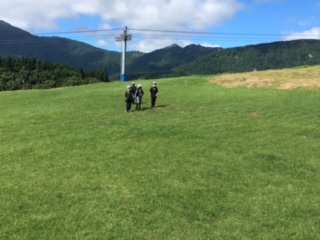 午前中の活動は、ポイントラリーです。1日目に雨天の為に変更になったプログラムです。快晴でさわやかな風を感じる中、ハチ高原を散策しました。