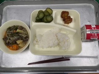 今日の献立は、ごはん、牛乳、肉じゃが、あつあげのみそだれかけ、きゅうりのゆずの香あえです。
