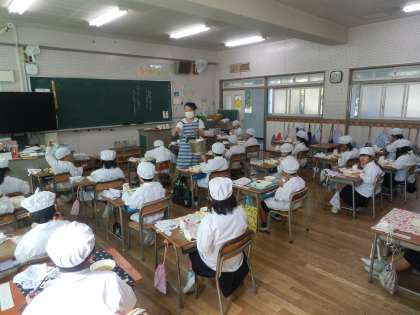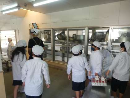給食室に給食をもらいに行くときは、みんな「いただきます」と挨拶をして入っていきます。