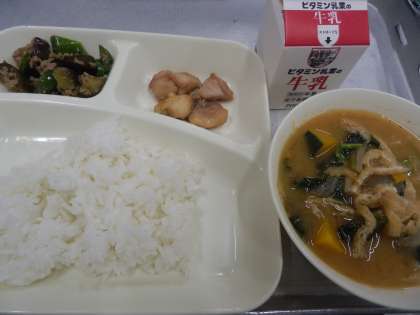 今日の給食は、ごはん、牛乳、鶏肉のみそ汁、なすのそぼろいためです。なすのそぼろいためには、ピーマンも入っていて夏野菜を堪能しました。みそ汁にもかぼちゃが入っていて、ほんのり甘めのみそ汁がおいしかったです。