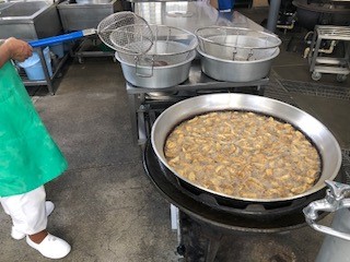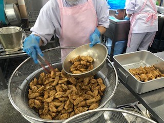 調理員さんは、高倉中学校のぶんも入れて、約2300個のぎょうざを、暑い中揚げてくれました。皮がカリカリでおいしかったです。