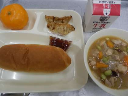 今日の給食は、コッペパン、いちごジャム、牛乳、あげぎょうざ、鶏肉ととうがんの中華煮、みかん(れいとう)です。