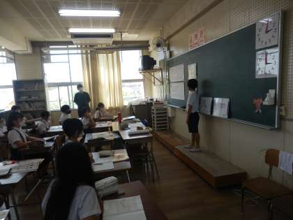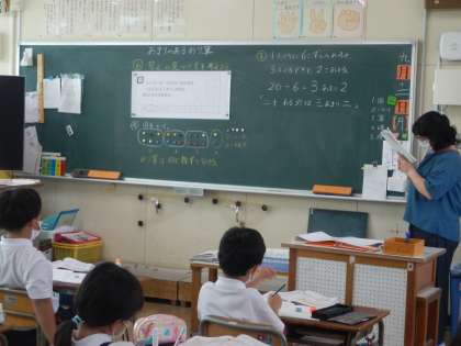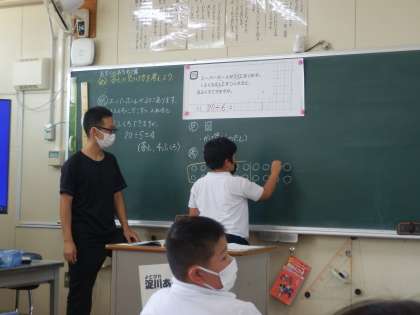 あまりのあるわり算の学習を行いました。図をかいて丸で囲みながら、いくつあまりが出るのかを見つけました。また九九を使って答えも求めました。自分の考えをみんなの前で発表もできました。