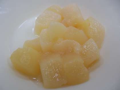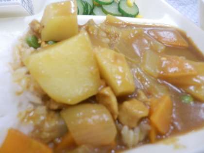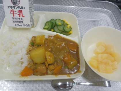 今日の給食は、チキンカレーライス、きゅうりとコーンのサラダ、白桃(かんずめ)です。今日の給食にも出ている桃には、果肉が白色の「白桃」と黄色の「黄桃」があります。おもに産地は、山梨県、福島県、長野県、山形県、和歌山県です。今日の給食に出ている桃は山形県産の白桃を約2センチメートル角に切った缶詰が登場します。