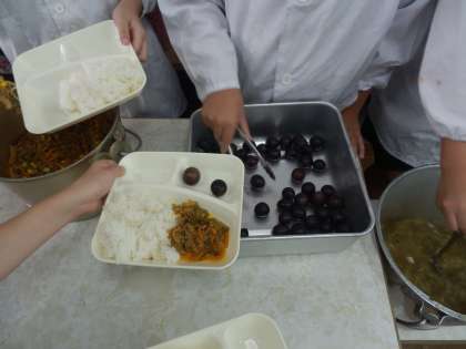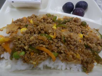 今日の給食は、牛乳、野菜たっぷりカラフルライス、キャベツときのこのスープ、ぶどう(巨峰)です。今日の給食は、学校給食献立コンクール優秀賞献立です。大阪市福島区吉野小学校5年2組の給食委員会の作品です。この給食を作ったねらいは、運動や勉強を元気にがんばれるように、食欲がでるカラフルな色合いになるように考えました。たまねぎ、にんじん、ピーマン、枝豆、コーンなど様々な野菜が入っています。