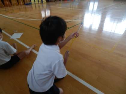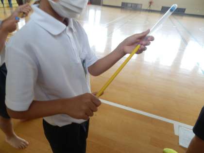 4年生の理科では、空気の働きの学習で空気鉄砲を試していました。