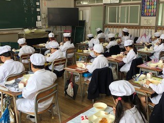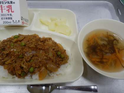 今日の給食は、牛乳、タコライス、もずくのスープ、焼きじゃがです。「え〜タコ入っての?」と言っている子どもたちもいましたが、安心してください!タコライスには、タコは入っていません。沖縄県の人気の料理で牛ひき肉、豚ひき肉などを炒めて味付けした具をごはんにかけて食べます。沖縄の伝統的な料理は、琉球料理とも呼ばれ、豚肉やとうふ、こんぶなどの海そう、野菜を使った料理が多く、栄養バランスにすぐれています。