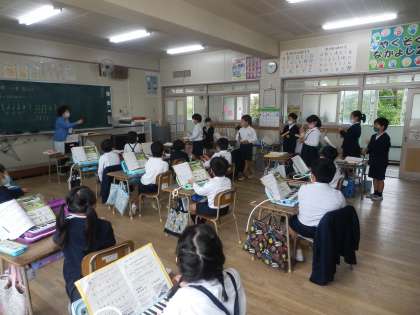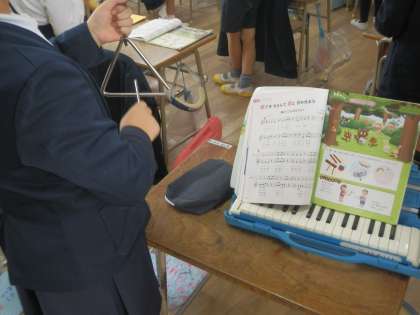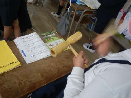 「森の たんけんたい」の音楽でいろいろな楽器をもってリズム遊びをしました。先生から楽器の音の鳴らし方を教わって、ローテーションでさまざまな楽器に触れました。にぎやかな「森の たんけんたい」になりました。