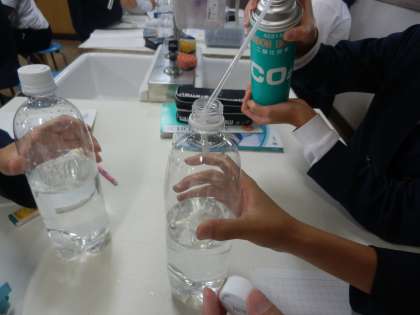 先日の実験では、炭酸水には二酸化炭素が溶けていることがわかりました。今日はその二酸化炭素を水に溶かしてみたらどうなるのか!?を実験しました。ペットボトルの水に、二酸化炭素を注入し、そのあとペットボトルを振ってみると…。あら不思議! 楽しく二酸化炭素の性質を学びました。