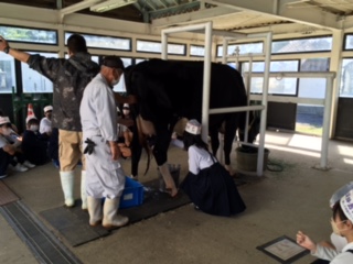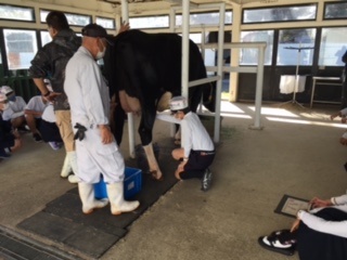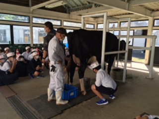 淡路島牧場での次の活動は、乳しぼり体験です。初めてで腰が引けていましたが、全員が体験することができました。