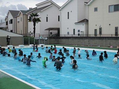 5,6年が着衣泳を体験しました。服を着た状態で水に入るとどんな感じになるかを体験し、万一の時に落ち着いて行動できるようという目的の学習です。