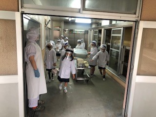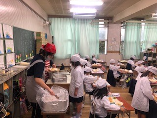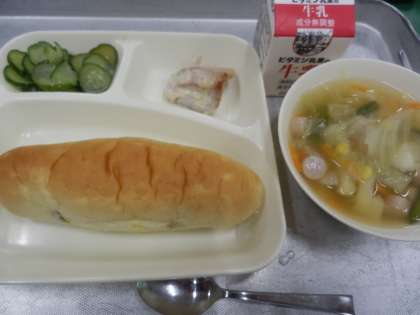 今日の給食は、おさつパン、牛乳、カツオのマリネ焼き「ノンエッグドレッシング」、ウインナーとじゃがいものスープ、きゅうりのサラダです。かつおは、さしみやたたきのように生のまま食べるほか、煮物、焼き物などいろいろな調理法で食べられています。