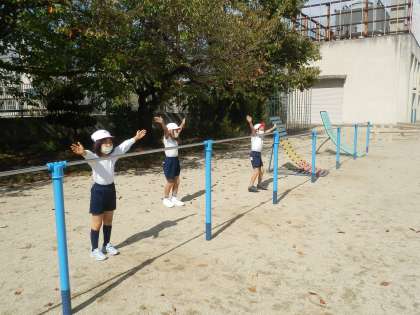 2年生が新しくなった鉄棒でいろいろな運動あそびをしていました。後ろとび下りが上手でした。技が決まった後のポーズも決まっていました!