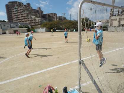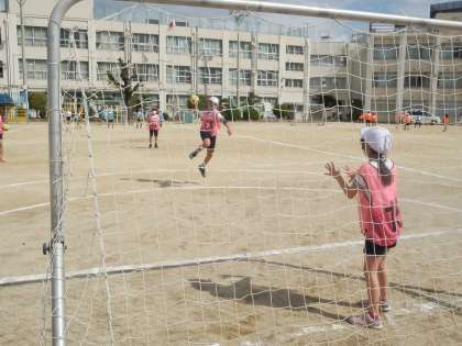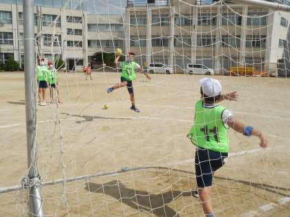 5年生の体育では、ハンドボールをしています。ゴール前の白熱した状態からの、ジャンピングシュート!!とってもかっこよく決まっていました!