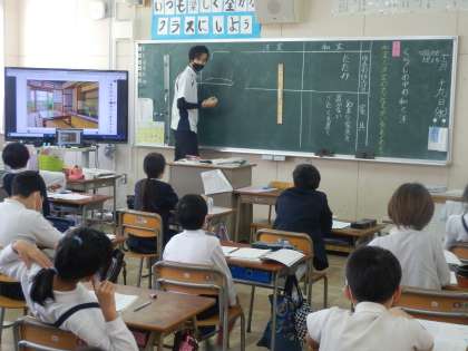4年生の教室では、「くらしの中の和と洋」の学習をしていました。今日は和室と洋室の違いを表に書きまとめていました。「自分の家は洋室があり〇〇があるけど、おばあちゃんの家は和室しかないな」「和室ってすごいな!」「いや洋室のほうがいい!」など自分の考えを自由に表現していました。