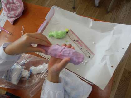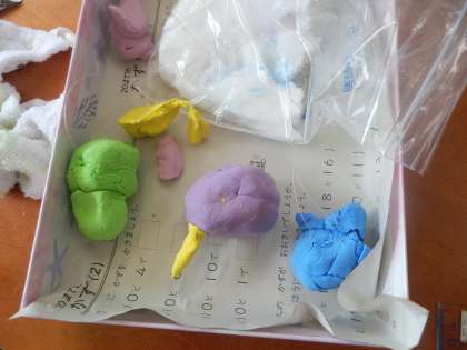 1年生の教室では、水族館の中の生き物づくりをしていました。粘土に自分の好きな色を着色し、様々な生き物を作っていました。かわいらしい水族館ができそうです☆