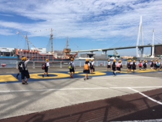 午前中は海遊館で、沢山の海や川の生き物を見て、楽しいひと時を過ごしました。これからお弁当の時間です。みんなで仲良く食べましょう。