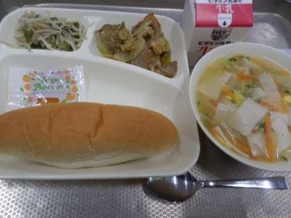 今日の給食は、コッペパン、牛乳、豚肉のカレー風味焼き、はくさいのスープ、もやしとピーマンの炒め物、アプリコットジャムです。緑のグループの食べ物をしっかり食べましょう!緑のグループの食べ物は、野菜や果物、きのこです。主に体の調子を整える働きがあります。その他にも、かぜをひきにくくする。おなかの調子をよくする。肌をじょうぶにする。などの働きがあります。