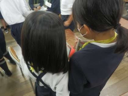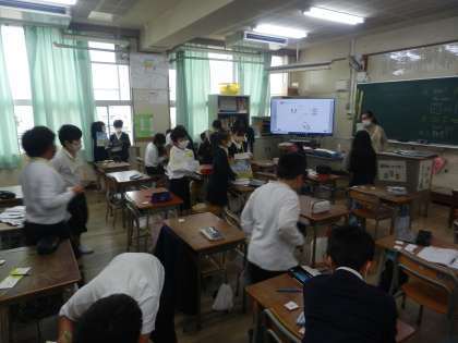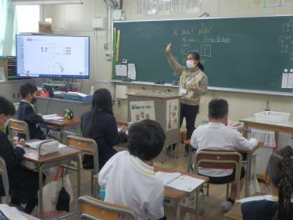 3年生の教室では、外国語の先生と英語の学習をしていました。今日は自己紹介をする学習で、相手の好きなものや色などを英語できいてインタビューをしていました。