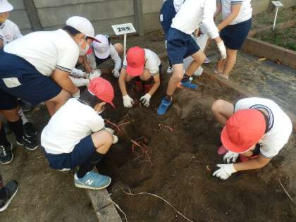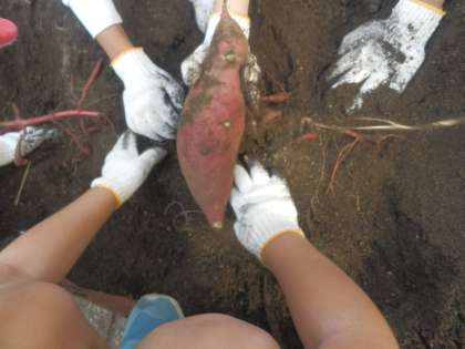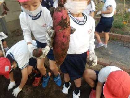 一生懸命育てた、サツマイモの収穫を行いました。少し土を掘ると大きなさつまいもが顔を出しました。「うんとこしょ!どっこいしょ!」たくさんの立派なさつまいもが採れました!