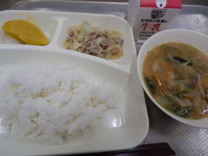 今日の給食は、ごはん、牛乳、豚肉と野菜のいためもの、いわしのつみれ汁、かぼちゃういろうです。ういろうは、米粉、砂糖などを混ぜて蒸して作ります。上に小豆をのせた「水無月」や生地にまっ茶を混ぜたものもあります。今日の給食には、かぼちゃペーストを混ぜた「かぼちゃういろう」が出ました。