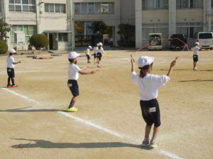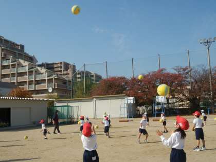 1年生の体育では、なわとびやボールを使った運動遊びを行っていました。なわとびは決められた時間の中で、どのくらい連続して跳ぶことができるかを行いました。ボールを使っての運動では、ボールを上に高く上げて手をたたいたり、地面でドリブルをしたりしました。
