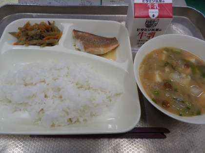 今日の給食は、あかうおのしょうゆだれかけ、なめこのみそ汁、きんぴらごぼう、ごはん、牛乳です。みそ汁に入っているなめこは、ブナの切り株などに発生するぬめりのあるきのこの一つです。秋には天然のなめこが市場に出回ることがあります。今日の給食では、みそ汁の実として使用しています。