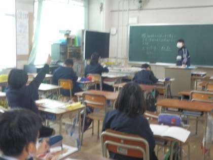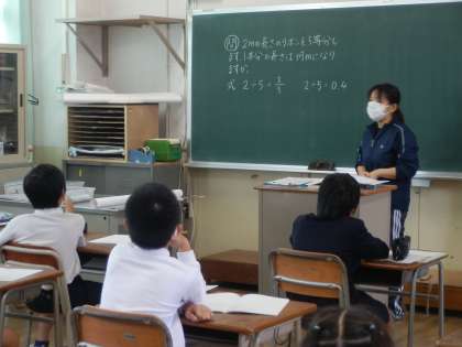 5年生の算数では、3分割に分けて授業を進めていました。今日の学習は、分数を小数で表す方法を考える問題です。
