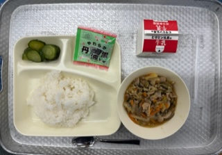 今日の給食は、中華丼、きゅうりのピリ辛あえ、牛乳です。中華丼には、今から旬の白菜がたくさん入っていて、おいしかったです。きゅうりは、ラー油を使って辛みをだしていましたが、辛すぎず食べやすかったです。給食にはいろいろな豆が登場しますが、今日は丹波黒大豆を甘くしたのが付きました。