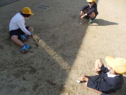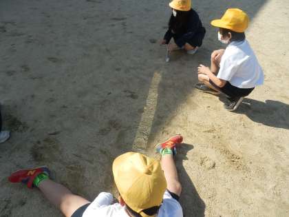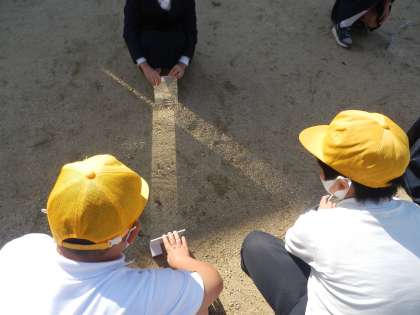 運動場で鏡を使って、太陽の光の反射の実験を行っていました。光はまっすぐ進むことを知り、友だちと声をかけあって反射の仕組みを学びました。