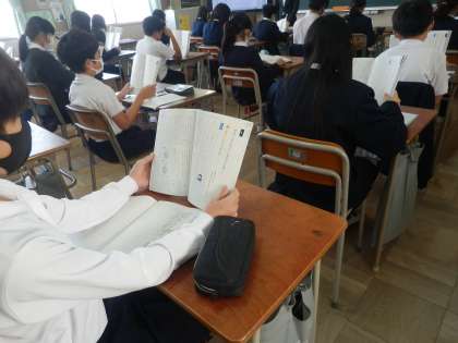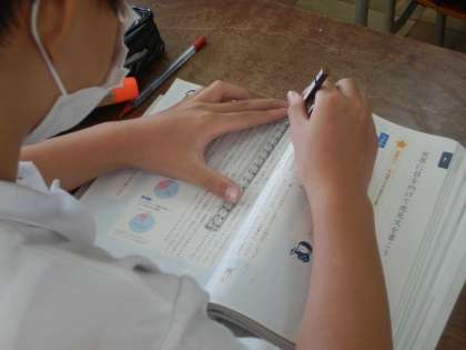 6年生の国語科では、「世界に向けて意見文を書こう」の学習をしていました。本論部分を読んで、事実や感想・意見・主張を見つける学習活動を行いました。また、文末表現にも着目し今後自分が意見文を書く際にどのようにすれば説得力のある文章を書くことができるのか学ぶことができました。
