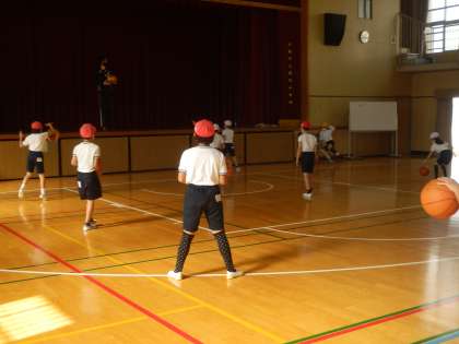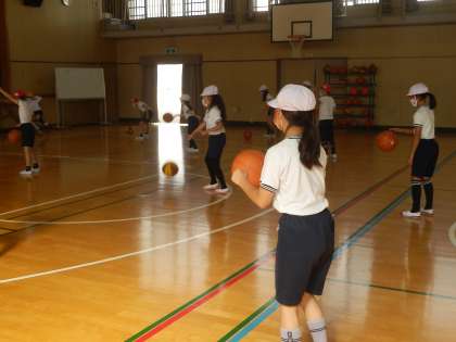 4年生の体育科では、ボールに慣れようをテーマに、バスケットボールを使っていろいろな動きをおこないました。両手でボールを交互についたり、ドリブルをしながらじゃんけんをしたりしました。