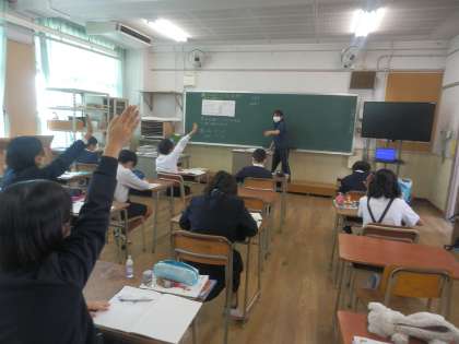 5年生の算数では、輪投げの結果で、どこの班がいちばんうまく投げることができたかを説明する学習です。投げた数と入った数に着目し、それぞれ、もとの数の〜倍なのかを調べていました。このあとの学習で、割合や百分率につながっていきます。難しい単元ですが頑張ってください。
