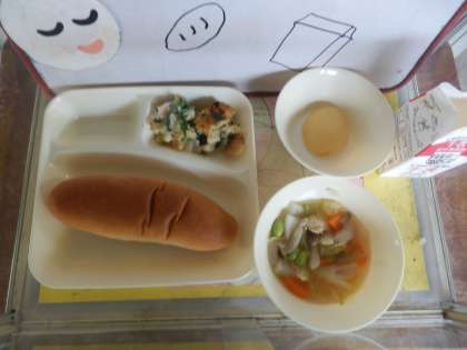 今日の給食は、黒糖パン、牛乳、ほうれんそうのグラタン、スープ煮、白桃(かんづめ)です。いつも給食は、心をめて挨拶することができていますか?「いただきます」動物や植物の命をいただいていることや、食事ができることへの感謝の気持ちを込めています。「ごちそうさま」この食事のために準備をしてくれた、たくさんの人たちへの感謝の気持ちを込めています。